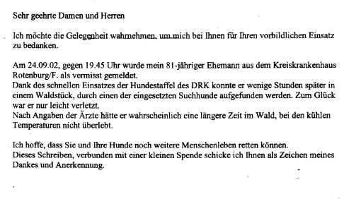 Vermißte Person gefundenDankschreiben einer Angehörigen